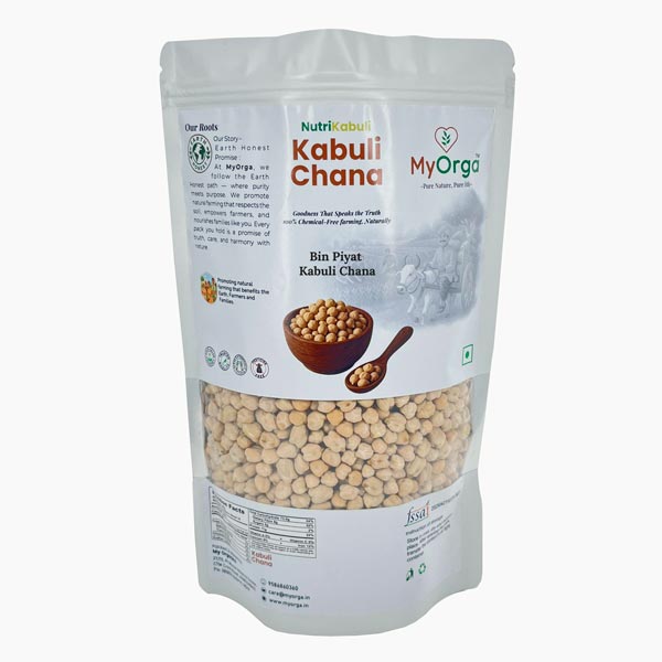 MyOrga Kabuli Chana is handpicked from trusted Indian farms where crops are grown traditionally using only natural methods — without any synthetic fertilizers, pesticides, or preservatives. These large, creamy-white chickpeas are rich in nutrition, easy to cook, and perfect for healthy Indian and global dishes.